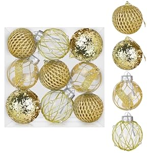 Mupera 70mm/2.8″ Christmas Ball Ornaments – 9 Pcs Shatterproof Christmas Ornaments for Xmas Tree, Clear Plastic Glitter Hanging Balls for Wedding Household Office Holiday Party (Gold)