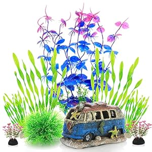 Fish Tank Accessories includes: 1 pieces resin broken car, 8 Pieces assorted Heights aquarium plants: (2 – 8.2 inch and 1 large plant: 12 inch, including green, pink, purple).