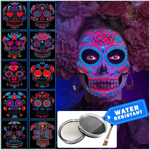 HIGH QUALITY PROFESSIONAL MAKEUP KIT – We’re here to help you save time and effort looking for a complete set Day of the Death Temporary Face Tattoo. You will get 10 Sheets Sticker Sugar Skull Temporary Tattoo with 2 White and Black Face Paints, and a makeup Brush. You’re now ready to embrace the spirit of Dia de los Muertos celebration.