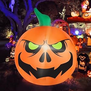 🎃【Scary Halloween Decorations】This inflatable pumpkin with angry face and green eyes can create a horrible atmosphere on Halloween night, it will be one of the most attractive Halloween decorations for your Halloween party. It is perfect for indoor and outdoor decorations for houses, gardens, patios, parties, lawns, Halloween night events, Halloween costume parties and more!
