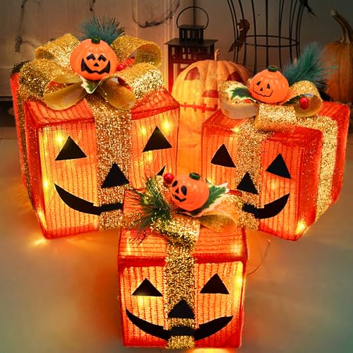 【Package Included】Package includes 3 different size lighted halloween pumpkin gift boxes(3AA batteries are not included),giving eerie and horror atmosphere.