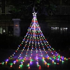 【320 LED Christmas Lights】Christmas decorations lights are made with super bright 320 LEDs, consisting of 9 string lights of 32 led each. The top star diameter is 12.6in. Each string drops 11.5ft. The plug cable length is 16.4ft. Light up your house or yard, bringing you into a fairy world with starry lights, creating a cozy and festival mood for your home.