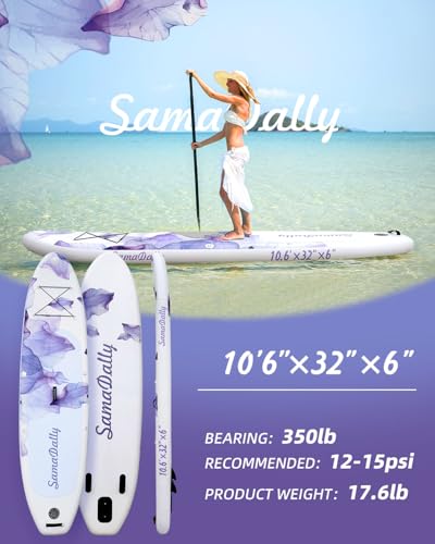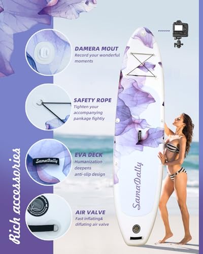 [SUP Design] – SamaDally 10.6ft x 32in Inflatable SUP features a charming and unique purple floral design. Provide a stable and balanced platform for all users, suitable for various water sports.