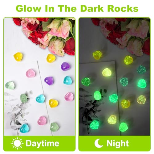Widely Used — Glowing rocks are great for indoor and outside decoration.it may be used for fish tank,aquarium,vase,potted plants,yard,garden,backyard walkway,pathway or driveway and so forth.the glow at night is very attractive.