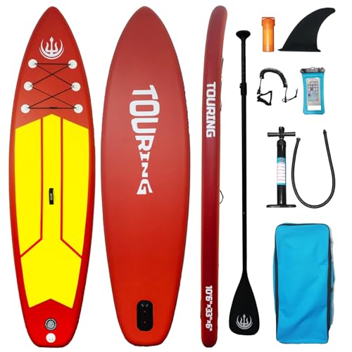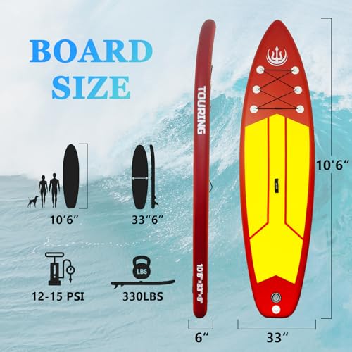 PREMIUM AND STURDY CONSTRUCTION: Our inflatable stand up paddle board is made of high-quality double-layer PVC with high-grade drop seam construction for enhanced durability. It is 10’6” long, 33” wide, and 6” thick to provide a larger stability area, and weighs only 17.6 pounds, but can support up to 330 pounds. This sturdy construction ensures your board will stand the test of time, providing a reliable and long-lasting water adventure. Suitable for all skill levels and conditions.