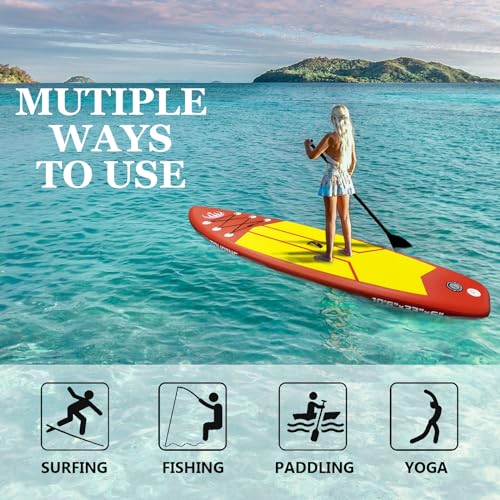 NON-SLIP EVA DECK: The paddle board is made with a non-slip EVA deck for maximum durability, anti-skid and comfort, this inflatable sup can be used in various water conditions, such as oceans, lakes and rivers, and is versatile and can be used for yoga, surfing, exploring, traveling and fishing.