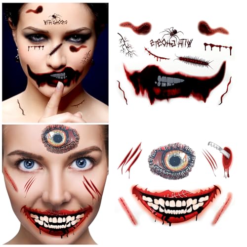 Diversified design: This unique Halloween temporary facial tattoo set features various patterns such as mouth, bloodstains, spiders, bugs, eyes, and claws. Mix and match these designs to create the ultimate personalized and quirky appearance that stands out in any event.