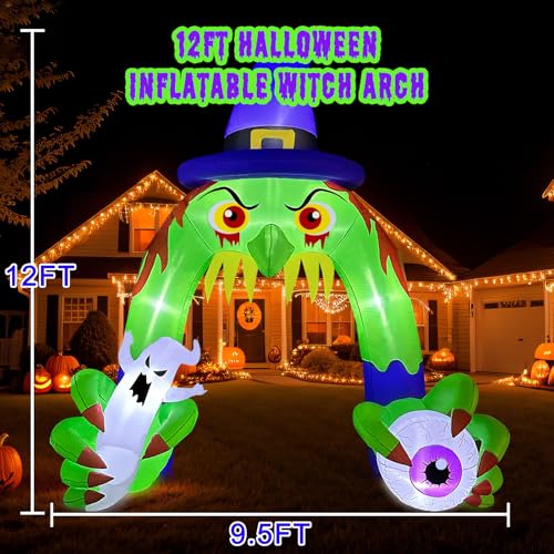 【Impressive Halloween Decorations Outdoor】: Create a spooky entrance to your Halloween party with our 12-tall inflatable witch arch. Its bright colors, bleeding eyes, hands grasping ghosts and eyeballs create an unforgettable visual impact that attracts the attention of trick-or-treaters and passers-by, setting the perfect horror tone for your Halloween celebration.