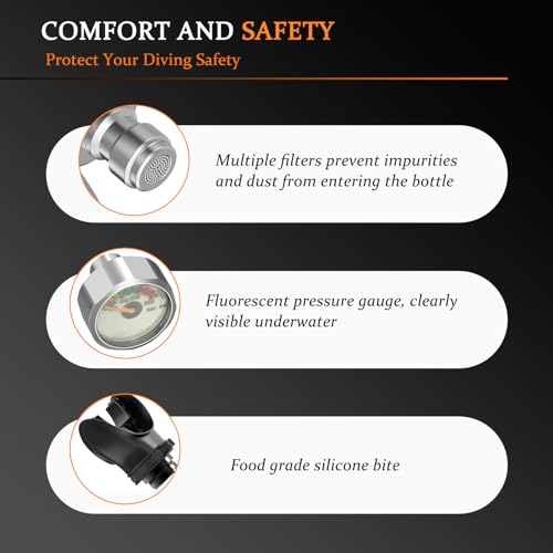 🌀30-Inch Expandable Pressure Gauge: Our scuba diving tanks come with a 30-inch expandable pressure gauge that can rotate 360 degrees. Compared to other fixed pressure gauges, you can check the remaining air in the portable scuba tank at any time within a 30-inch range without moving the entire small scuba tank.
