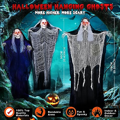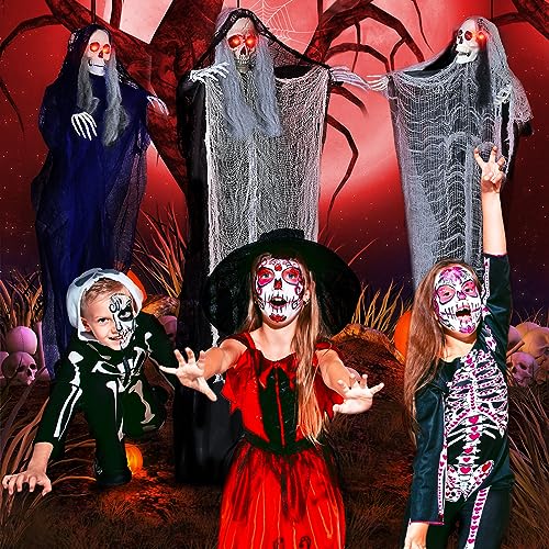 Value Halloween Skeleton Ghost Set – You are going to get 3 packs of hanging skeleton ghost Halloween decoration props, featuring different sizes and dresses. They have got creepy skull faces, long white hair, flexible arms, and flowing robes. Great for Halloween Grim Reaper Decorations for Halloween-themed Parties, Indoor and Outdoor Decorations, or Haunted House Decorations, will definitely assist you to add a creepy and scary atmosphere to your Halloween party!