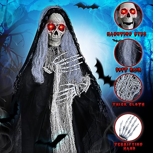 Scary Grim Reapers Design – The hanging Grim Reapers decorations look realistic and scary, featuring outstretched skeleton hands, ragged flowing robes, flashing LED lights, and thick white hair. When it’s windy, these lightweight Halloween ghost decorations will seem like they’re flying toward you and trying to catch you. The spooky Halloween decorations have a perfect size (one 59″ and two 35″), and they will definitely give kids and friends a special Halloween Trick or Treat night!