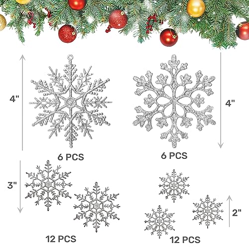 【Christmas Snowflake Ornaments】A group of 36 Christmas silver glitter snowflakes in 3 sizes and 2 different patterns: 6pcs for 4 inch for both styles, 12pcs for 3 inch and 12pcs for 2 inch. Snowflakes are covered with very beautiful glitter, Which is very suitable for indoor and outdoor winter Christmas decoration.