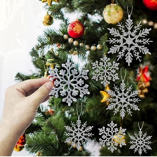 【Glitter Snowflake Ornaments Set】These glittery snowflake Christmas ornaments made of quality plastic and glitter powder, Sparkly glitter, Gorgeous and reusable. Each snowflake can sparkling in the lights due to the surfuce was covered with glitter. These silver glitter snowflakes tree ornaments add much more sparkle to your Christmas tree decorations.