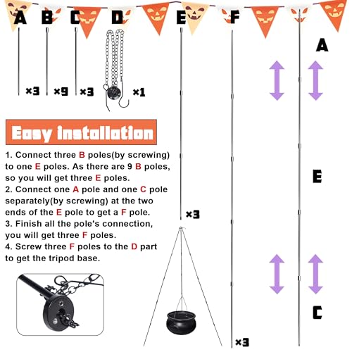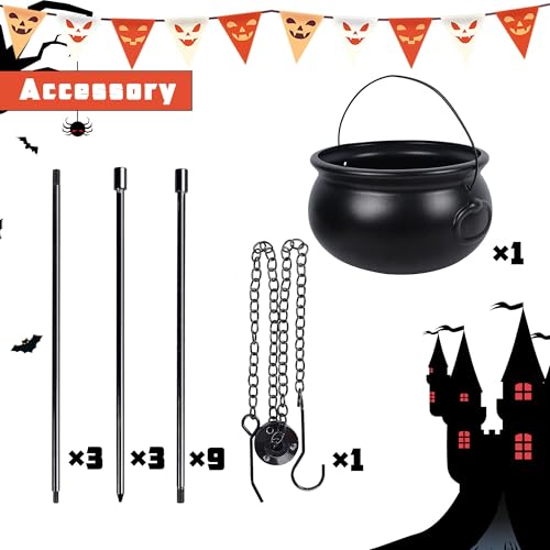 WITCH CAULDRON SET: Package includes cauldron*1, tripod topper with chain hook*1 and tripod poles*15. The finished height is 4.4FT. Place this set at your yard, lawn, front door, door way, floors or entrances, and it would definitely impress the passersby or trick-or-treaters and win compliments.