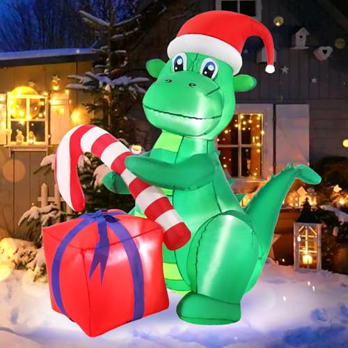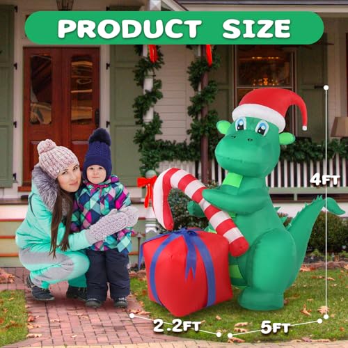 Unique and Adorable Design: The green dinosaurs sitting on the ground to bring a beautiful surprise for children. This inflatable green dinosaurs decoration provides a strong ambience of the Christmas, excellent idea of indoor/outdoor decoration for Christmas. Built-in LED lights make it become one of the most eye catching decorations at night. Get ready for a season filled with festive cheer and delightful memories with this versatile and charming decoration