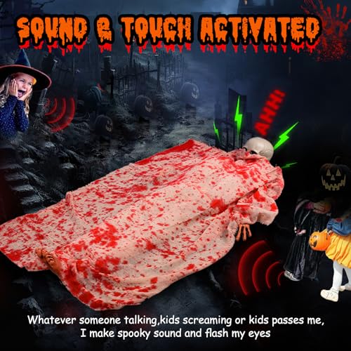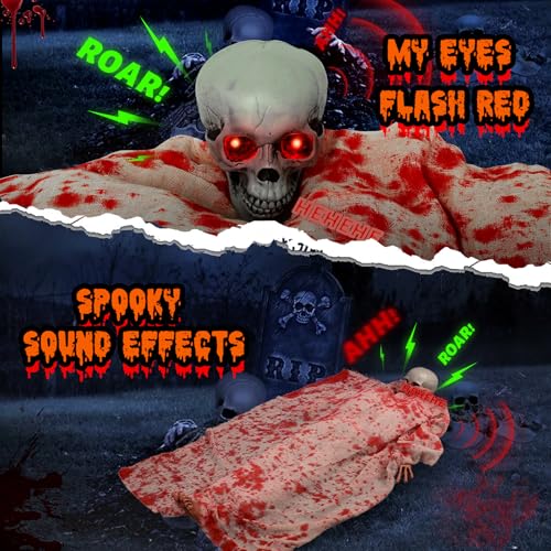 Sound and Touch Activated:The creepy halloween decoration is is equipped with the sound sensor,whatever you scream,clap or touch,our halloween dead victim skull will activate its creepy sound and red eyes,creating an unsettling atmosphere