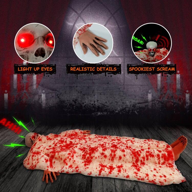 Dead Body Halloween Prop:Our dead body victim props was covered with blood-stained white cloth,only unveils his spooky eys on his skull.This terrifying dead victim who is quietly waiting for guests to arrive,it will create a realistic horror scene filled with the atmosphere of killing and death.Surprise your trick-or-treaters.