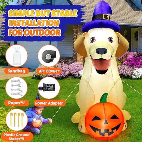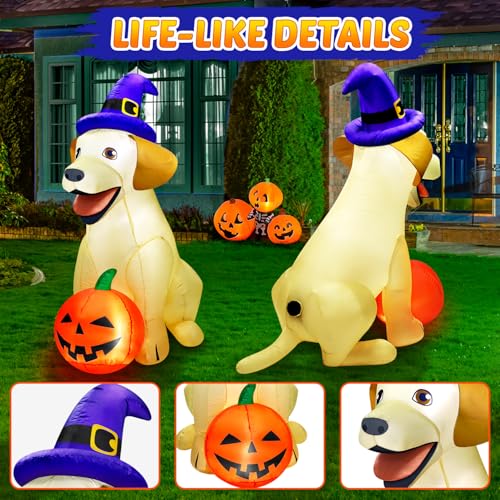 【5FT Lifelike Halloween Inflatables Lab Dog with Bright LED】zukakii 5Ft Halloween decorations outdoor Lab dog wears a cute wizard hat and holds a pumpkin, just like your loyal dog friend. With built-in super bright LED light meant to light up your house or front door festively, uniquely designed lifelike and childlike appearance will attract all ages trick-or-treaters, perfect for the fright night and ready to become the talk of your neighbors