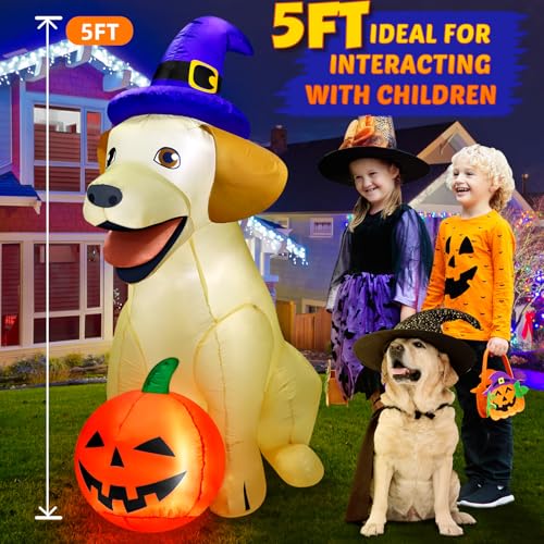 【5FT Lifelike Halloween Inflatables Lab Dog with Bright LED】zukakii 5Ft Halloween decorations out of doors Lab dog wears a cute wizard hat and holds a pumpkin, identical to your loyal dog friend. With built-in super bright LED light meant to remove darkness from your house or front door festively, uniquely designed lifelike and childlike appearance will attract all ages trick-or-treaters, perfect for the fright night and in a position to transform the talk of your neighbors