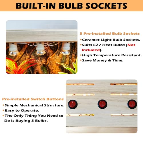 【Integrated Lighting Solutions】Equipped with built-in bulb sockets, our terrarium makes lighting setup a breeze. Two sockets are included (three for the 40/48-inch version), compatible with E27 heat bulbs, night lights, and more (bulbs not included). Simply install your preferred bulbs, and your reptiles will bask in the very best lighting conditions.