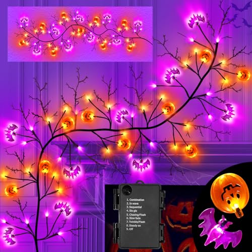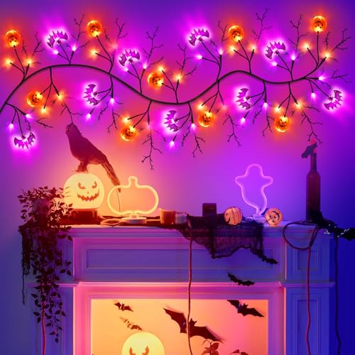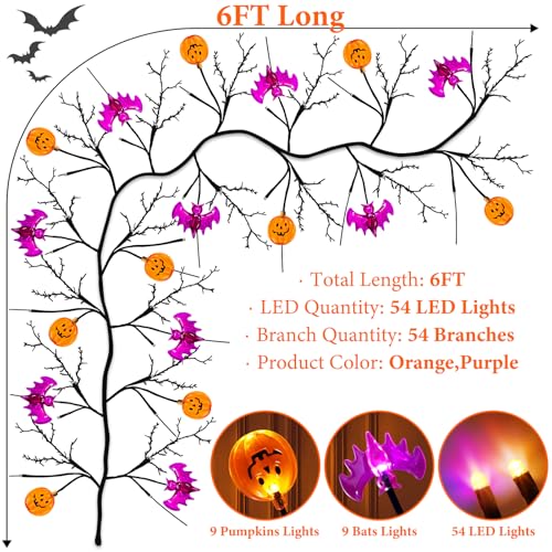 [Halloween Decorations]Package includes 6 Feet Long Realistic Halloween garland with 54 LED Orange & purple lights, that are composed of 9 pumpkins lights and 9 bats lights ,total 18 big branches and 54 small branches ,Ideal for completing Halloween decorations.