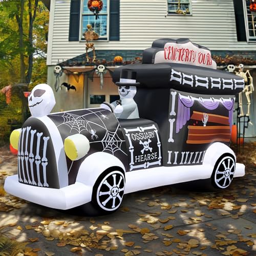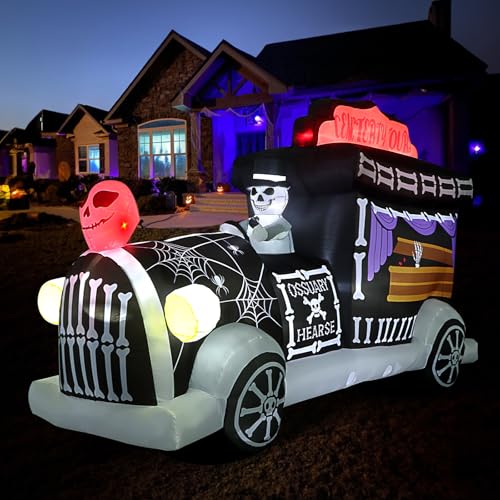 ORIGINALLY DESIGN: Our Halloween hearse inflatable decoration was once designed by ourselves which is special and unique. Designed by many Halloween elements including the coffin, reaper, skull, and spider, and the like. Built-in the led lights in red and white lights. Vivid design, contextualized & interesting design and bright color. Nice to decorate the yard, patio, and home for outdoors/indoors to create the Halloween atmosphere.