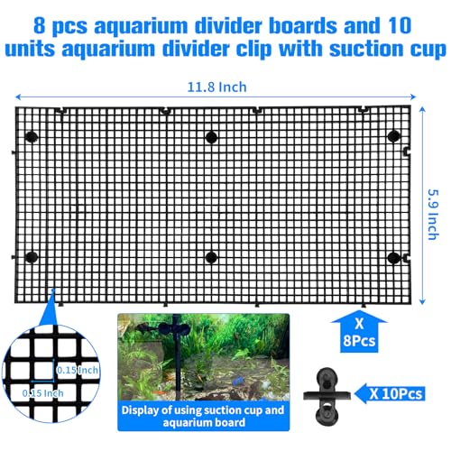 【Product size】aquarium divider separator kit includes 8pcs 11.8 Inch X 5 .9 Inch aquarium divider boards with 0.15Inch hole and 10pcs clips with suction.