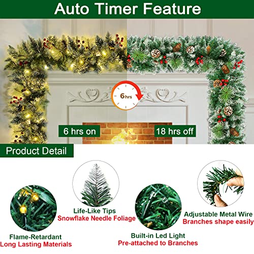🎄LUSH & FLUFFY PRELIT GARLAND – 9FT BY 10 INCH – The thick and life-like artificial garland with 282 individual branches tips arranged tightly, are designed to mimic nature, made of thick foliage-grade PVC needles with a rich, realistic, dense and crush-resistant. Including 240 green branches tips, 12 pine bristles, 18 enlarged pine cone, and 12 stems of total of 84 red berries to add a festival Christmas atmosphere