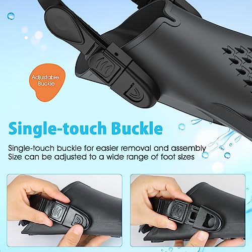 Adjustable Straps for Custom Fit – The heel strap allows for size adjustment, accommodating a wide range of foot sizes. The snug fit ensures comfort during dives or swims. With easy-to-detach straps, it can be worn over aqua shoes. It’s a strap fin with one-touch buckles for easy use. Recommended for growing children too
