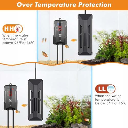 5 Protection Functions: When out of water automatic power off, avoid dry burning, “L1″error code reminder; When the water temperature is above 95 ℉, “HH” high temperature error code reminder; When the water temperature is below 59 ℉, “LL” low temperature error code reminder; Authentic and secure 3 plug, anticreep; High temperature resistant ABS shell, protecting fish from burns