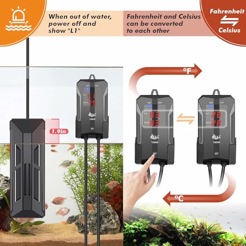 Conversion between Fahrenheit and Celsius: Fish tank heater temperature setting range 59-93 ℉/15-34 ℃; Pressing and holding the controller button for 8 seconds can achieve conversion between Fahrenheit and Celsius degrees