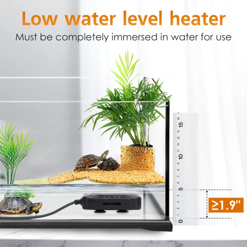 25W Small Submersible Heater: Suitable for 1-5 gallon fish tank; Temperature Keep an eye on Range 59℉-93℉; When the temperature is less than the set value 1℉, the heater Routinely heat up; Routinely stop heating when the set temperature is reached
