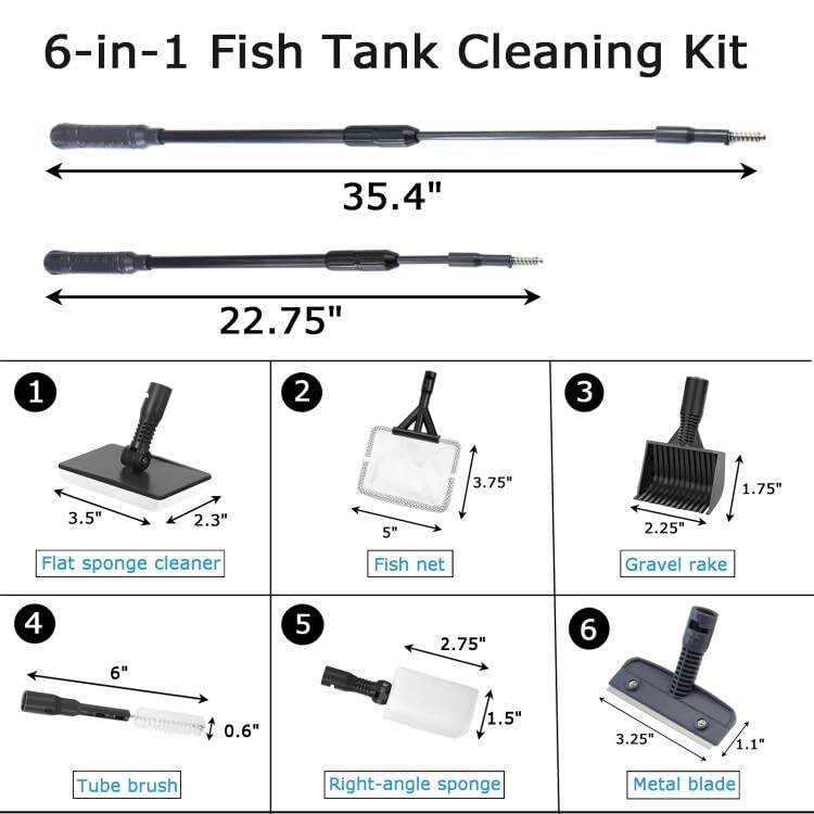 This 6-in-1 cleaning tool kit designed to keep tank neat and clean without getting hands wet with long adjustable handle which can extended to 36inch