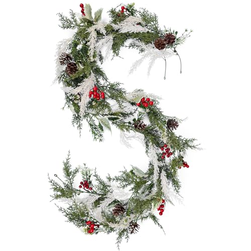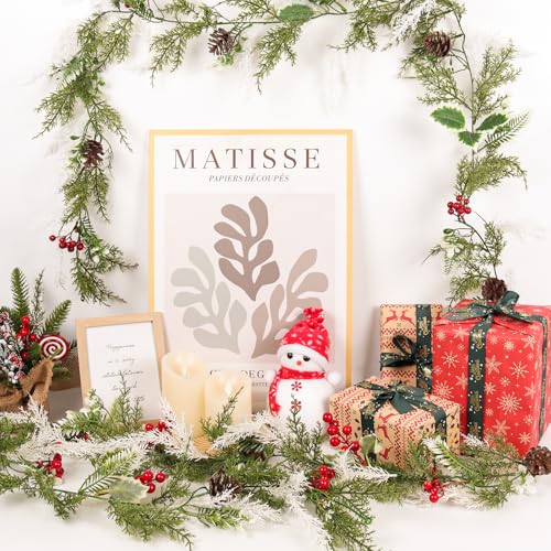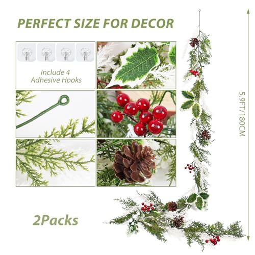 Christmas Berry Pine Garland Package: The packaging includes 2 pieces of artificial Christmas garlands and 4 hooks, each berry pine vine is 5.9FT/180cm long. The Christmas garland features a festive blend of red berries, pine cones, pine needles, cypress branches and green holly leaves, vivid and realistic, full of holiday colors and Christmas charm. Enough length to let you DIY, satisfy your various decorations needs, bring more fun and joy