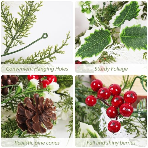 Xmas Decorations Wreath Material: Christmas greenery wreath with fine workmanship in every detail, quality silk cloth holly leaves, foam berries, plastic pine needles and pine cones, durable and vivid, bright colors, easy to store and can be reused. The stem is made of flexible plastic, not easy to break, bendable and pliable so you can shape the vine to fit your decorating needs. There is a small loop at each rattan end, which helps to you hang