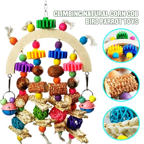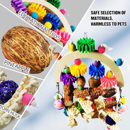 Made of corncob, natural rattan ball, wooden mango fruit, handmade, bright colors, harmless to pets, the bells hanging on both sides (can also be got rid of and used one at a time) can increase the interest of the birds. Easily attract parrot birds to chew and play, they are going to spend a very long time playing with these toys each day, keep your parrot busy, less destructive and more fun.