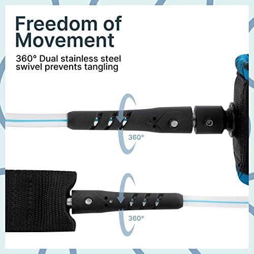DUAL SWIVEL FOR NO TANGLING & DRAGGING – The tight coiling equals NO kinking, leash dragging, or snagging submerged objects. This paddleboard leash absorbs wave impact and can be stretched up to 5 times the coiled length. Pair it with a Waterproof Waist Bag for your belongings. Wear it any way you want and enjoy the benefits of joining the BPS family!