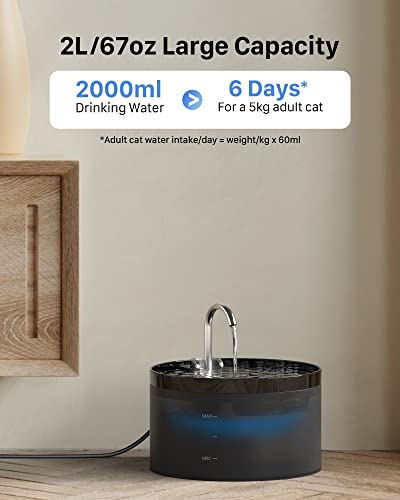 【2L Capacity, Removable And Easy To Clean Parts】 The cat water fountain has 2L (64oz), so you don’t need to refill it frequently. A cat water fountain filled with water can provide your pet with 4-6 days of drinking water. The cat water fountain has a detachable design and its parts are removable, which is very convenient for you to replace or clean.