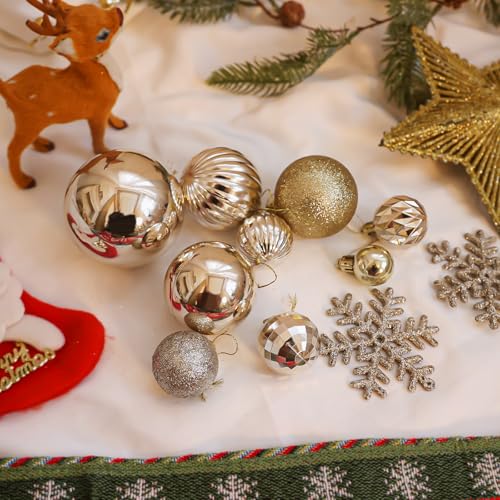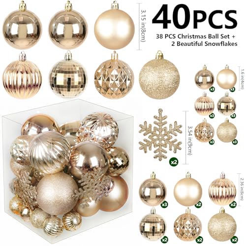 CLASSIC ORNAMENT SET: This set offers 40 beautiful ornaments, it contains 7 large balls (3.15 inches, 80 mm), 13 medium balls (2.36 inches, 60 mm), 18 small balls (1.57 inches, 40 mm). Two more large ball options than the traditional set, and two beautiful shiny snowflakes are included!