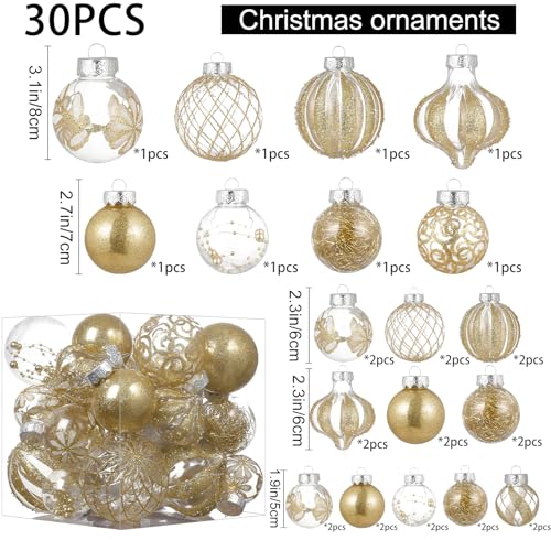 Gold Christmas Ball Ornaments:These Christmas ball decorations are made of durable and environmentally friendly plastic with excellent shatter resistance. These Christmas balls have shiny decorations and a transparent glaze base, which are perfect for hanging on your Xmas tree and decorating your Home with them,this will become part of your vacation.