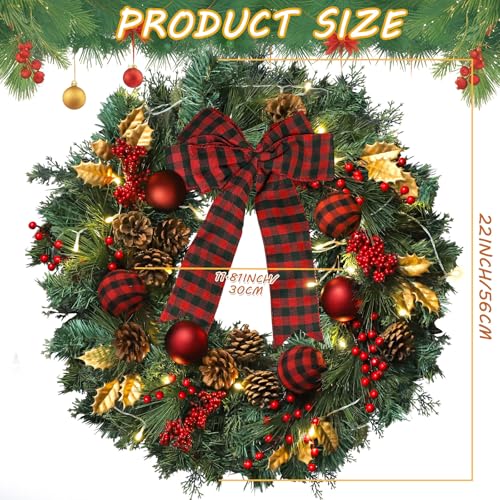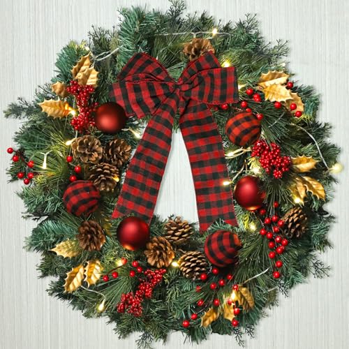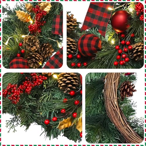 ORIGINAL DESIGN Christmas wreaths contains Pine Branch,Christmas Ball Ornaments,Bows,Pine Cones,Berry ,sparkling lights.Every detail of the Christmas door wreath has been carefully designed to look luxurious and full, making your home look premium and beautiful!