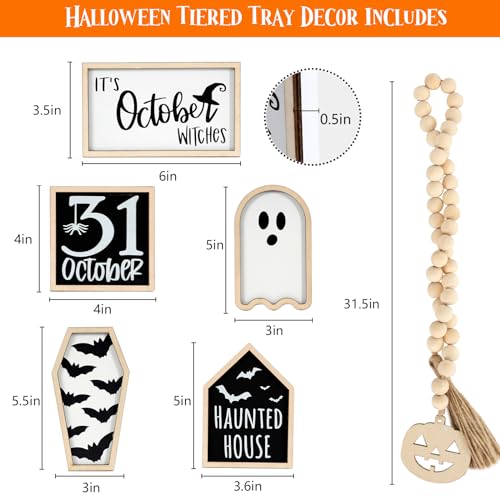 Spooky Halloween Decorations — The pack includes 5 wooden Halloween signs and bead garland so we can indisputably be a hit of your Halloween home decor! (Tiered Tray NOT Included)