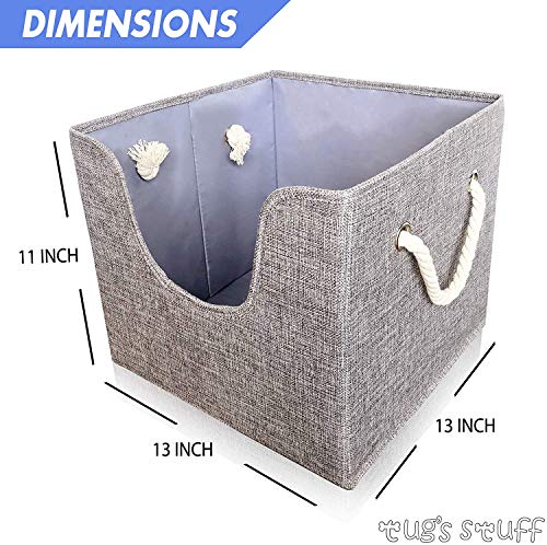 PORTABLE & COLLAPSIBLE DESIGN: Equipped with sturdy woven rope handles, this dog storage organizer is easy to carry around. When not in use, simply collapse the dog toy box or large basket and store it away, making it a space-saving solution for any living room. JUST THE RIGHT SIZE: Measuring 13″ x 13″ x 11″, this dog toy storage bin fits seamlessly into most cubby systems, making it ideal as a basket for dog toys, cat toy basket, or blanket basket for the living room.