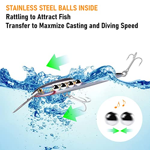 【Rattling Model Design】There are some steel balls inside, which makes it transfer to maxmize long casting and diving speed and generate some sounds to attract fish. Enhance your fishing experience!