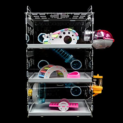 Large Hamster Cage — SIZE: 11.6″ L x 8.1″ W x 20.5″ H. Hamster cages features fun tubes to promote hamster exploration of their habitat, playful & healthy. 3-story construction provides a huge space for your small critter to exercise, relax and explore. Easy to clean and designed to provide excellent air circulation. Fully transparent for your viewing from multiple angles and at any time.