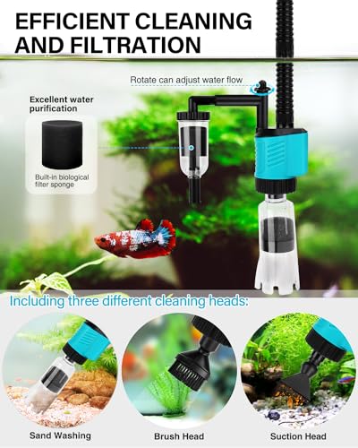 🐠🍀【6-In-1 Multifunctional Aquarium Cleaner】This fish tank vacuum is designed with a 20W powerful pure copper rotor motor, which can provide 320GPH strong suction and 5.1FT head height, easily and quickly water change, effective sand washing, water filter and cycle, mud & debris cleaning, glass wall cleaning, and also can use for turtle tanks shower. We have upgraded the blue filter sponge to black filter sponge.