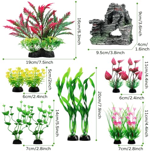 Fish Tank Accessories Aquarium Plants, QUOZUO 12pcs Colorful Fish Tank Artificial Plants and Cave Rock Decor Set, Aquarium Decorations Plants