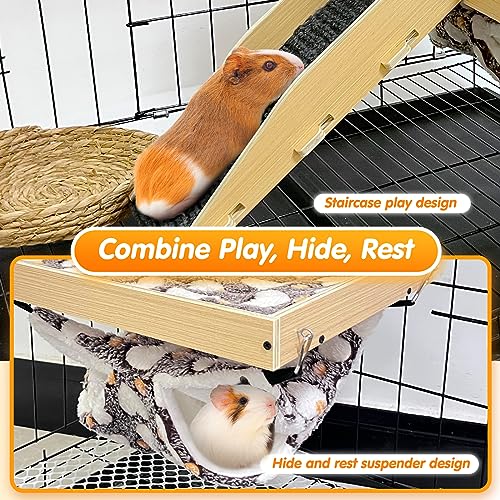 【High Quality Material】This guinea pig hideout is made of natural wood, which is secure and environmentally friendly, sturdy and durable, with excellent load-bearing capacity. At the same time, it can withstand deformation and damage, creating a secure hiding place for your small pets, the hammock and double-sided mat are soft, washable and reusable.