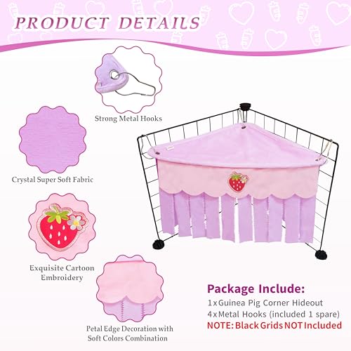【Perfect Size and Bundle Package】The top triangle is 18 x 13 x 13 inches / 45.7 x 33 x 33 cm, and the curtain length is 10.5 inches / 26.7 cm. Great for guinea pig, rabbit, bunny, ferret, rat, chinchilla, hedgehog, sugar glider, squirrel and other small animals. Package include: Guinea pig corner hideout x 1, Metal hook x 4 (included 1 spare). Note: Black grids NOT included.