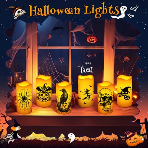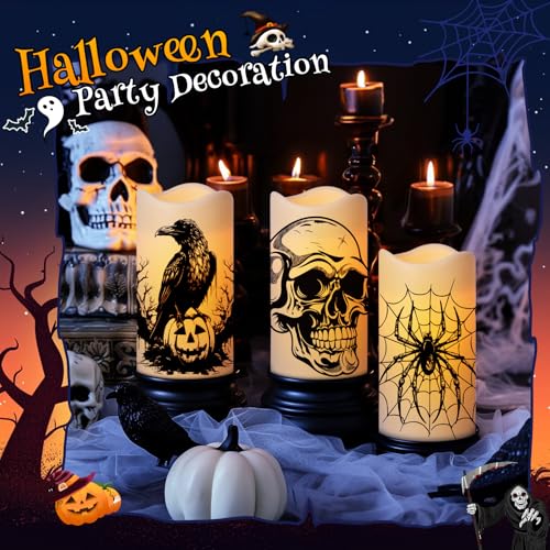 Halloween Decorations Indoor: Transform your dining table/window into a Halloween spectacle with these flickering flameless candles. Each candle features realistic flickering lights and double-sided decals with classic Halloween motifs, including skulls, spider webs, crows, pumpkins, and bats. Ideal for any Halloween table setting, they provide an eerie glow that is sure to impress your guests.